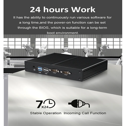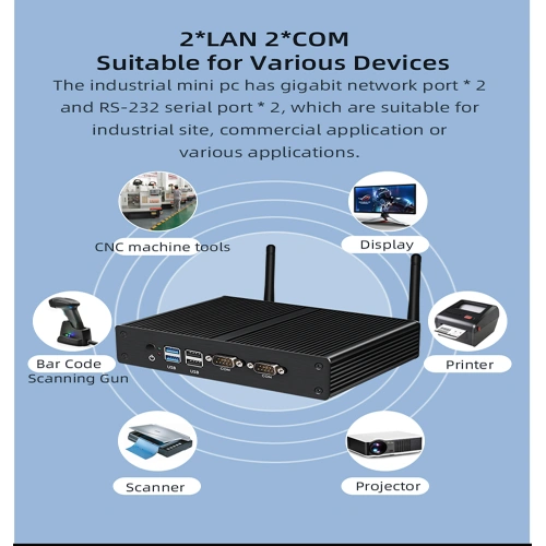Máy tính mini không quạt Intel Celeron J1900 có LAN kép là thiết bị công nghiệp dùng trong hệ thống điều khiển – tự động hóa, hỗ trợ vận hành chính xác, liên tục và dễ tích hợp.